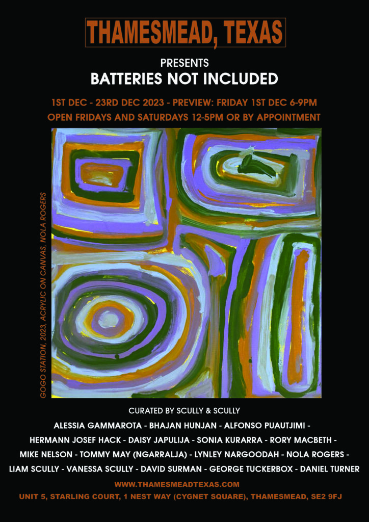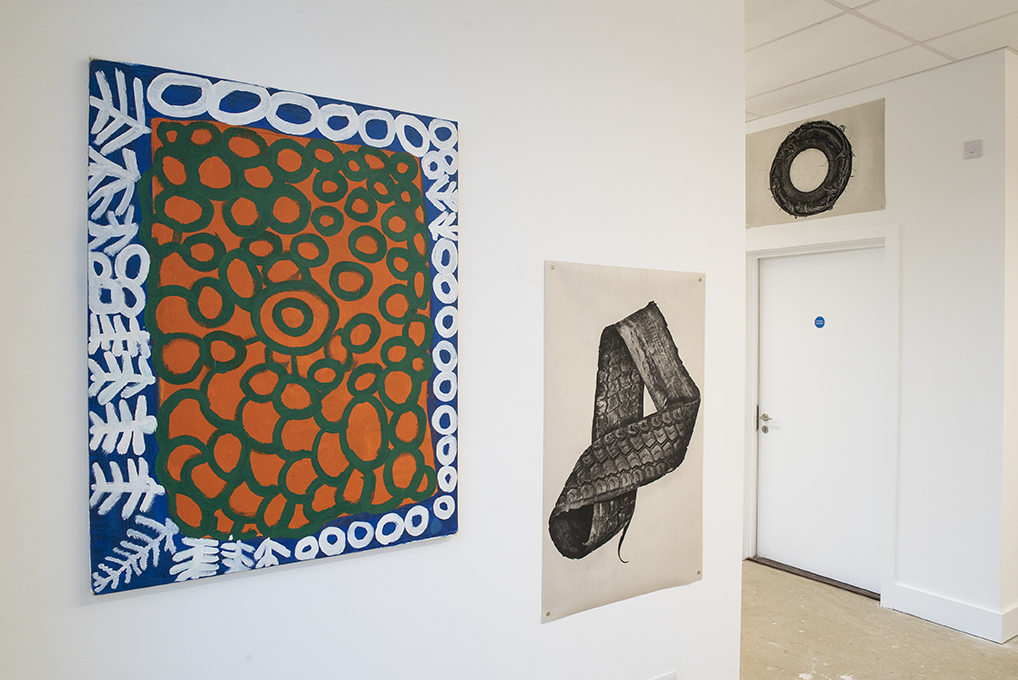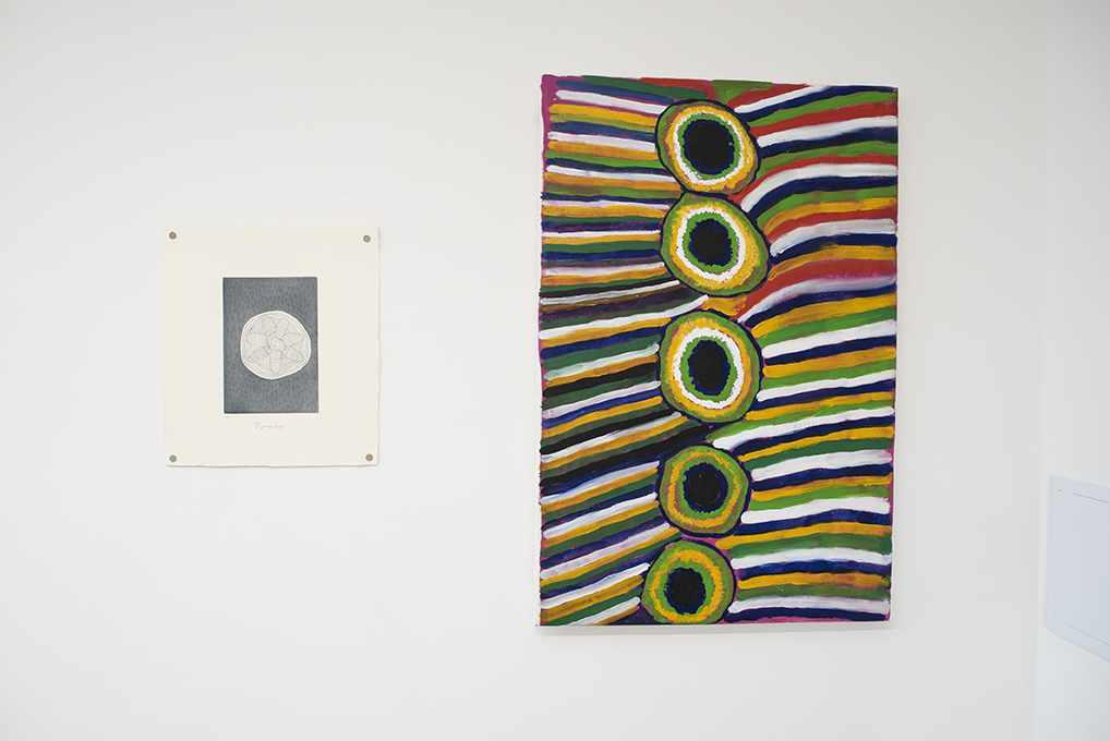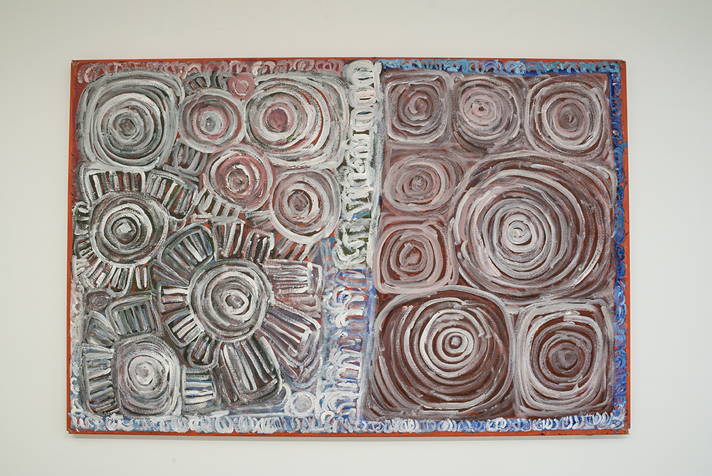 Flood and Drought are two polar extreme that is met upon the peoples of Fitzroy Crossing each year. Food and Dreaming is about reading the signs in order to survive these extremes. During the wet season the great Martuwarra (Fitzroy River) breaks her banks and during the dry season, months of drought ensues. It is the traditional owners of these lands that know how to seek opportunity and survive in these extremes; where to hunt, where to take shelter and how to catch food. All three painters are of a diminishing generation that know firsthand how to live off the land; this knowledge is then passed down to younger generations, through story, through dance, through song, or encrypted in their colourful abstractions.