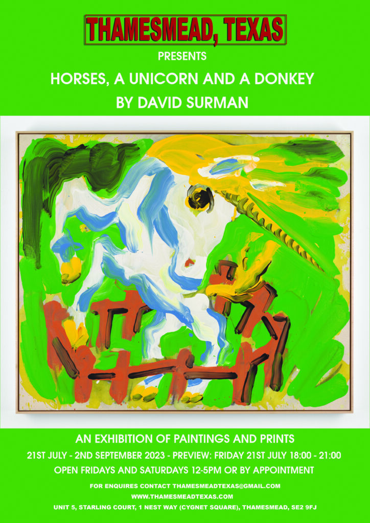 Thamesmead Texas is pleased to present: Horses, a Unicorn and a Donkey, a new solo exhibition of paintings and prints by British artist David Surman. For the first time we bring together a collection of work dedicated to Surman’s long obsession with the horse and its various guises.