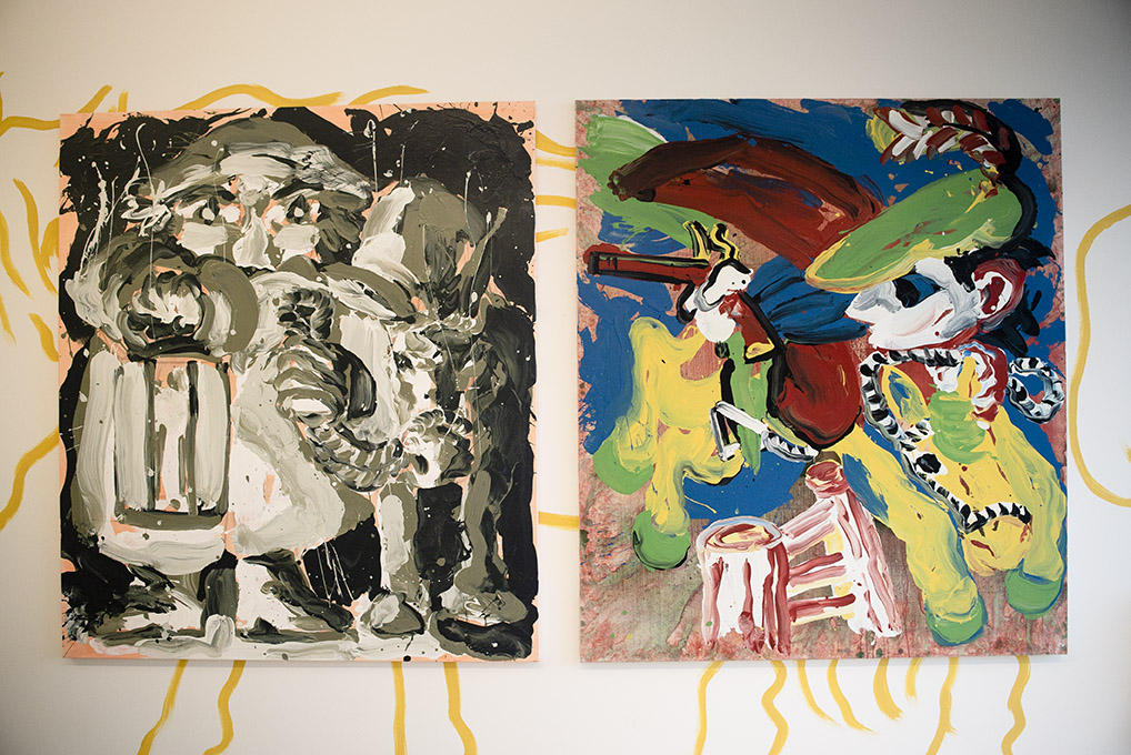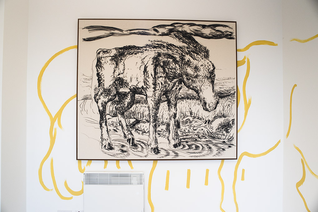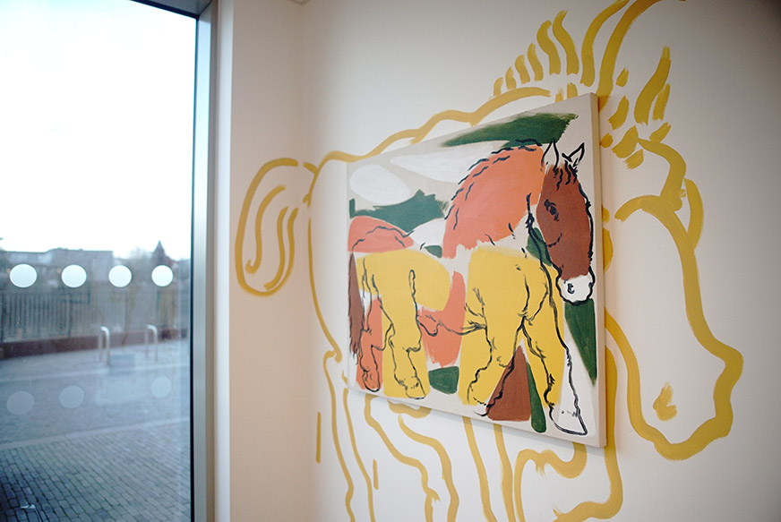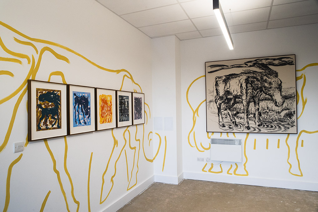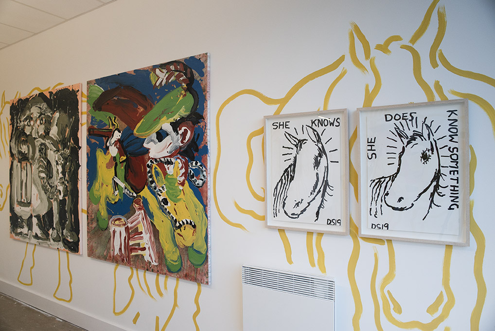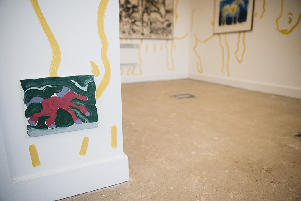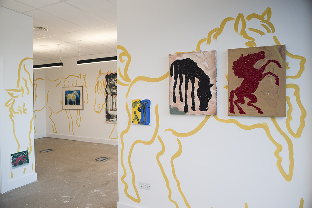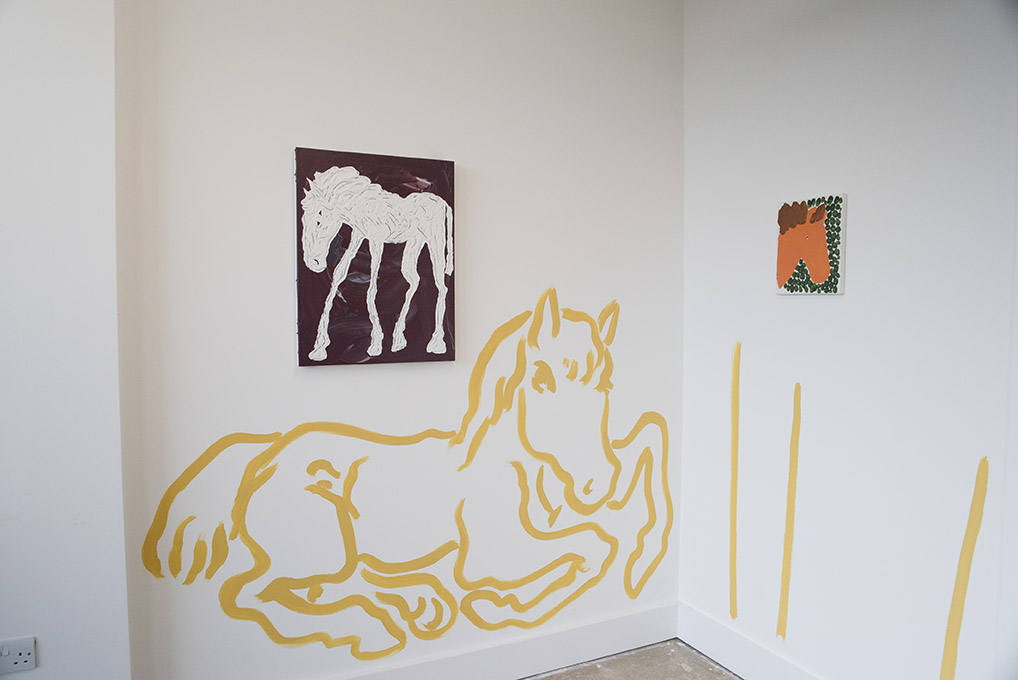 For Summer 2023 Thamesmead Texas takes up residence in Unit 5, 1 Nest Way, a vacant shop unit in Cygnet Square. The first in a series of exhibitions, David Surman directly intervenes in the commercial shop unit, mapping the space with a yellow ochre line drawing. This mural creates the setting for Horses, A Unicorn and a Donkey, where a collection of paintings spanning several years adorns the walls.